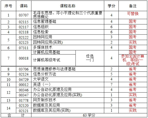 注:声像技术应用(课码02127,2学分)调整为多媒体技术(课码07311,4学分);信息用户与服务(课码02119,4学分)调整为网页制作技术(课码01778,3学分)。